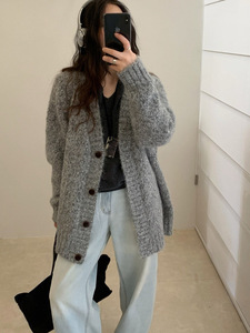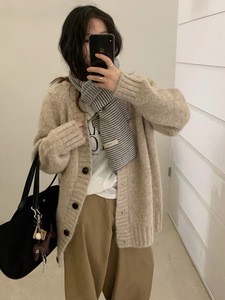 木四 宽松慵懒风V领针织外套女秋冬女装花线休闲毛衣开衫超厚6682