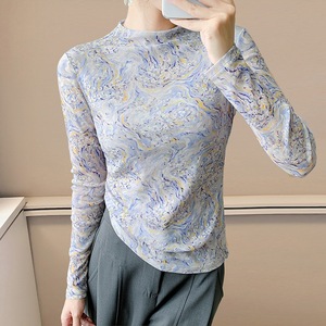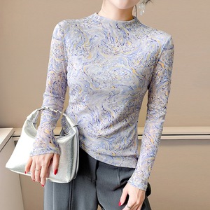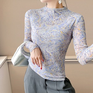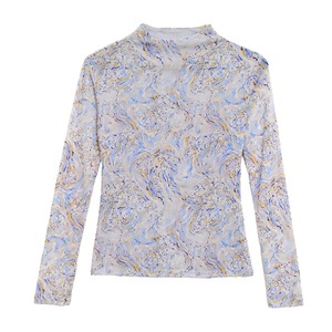 东南亚欧货女装2025秋冬时尚洋气高弹网长袖印花高领上衣实拍代发