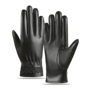 秋冬PU皮款女士保暖电动车骑行开车加绒触屏防风防寒防滑毛边全指