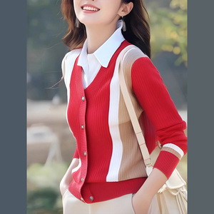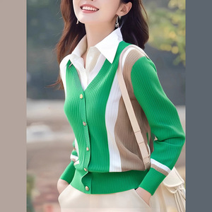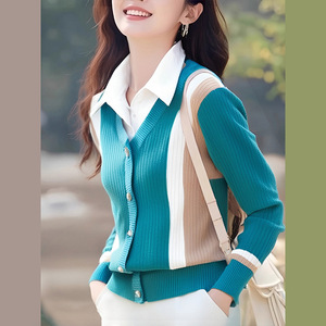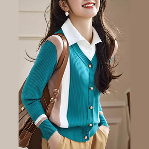 衬衫领假两件开衫女毛衣长袖撞色针织上衣春秋新款百搭时尚打底衫