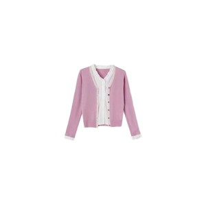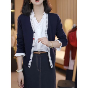 法式木耳边拼接假两件长袖针织衫女2025秋季新款洋气宽松V领上衣
