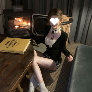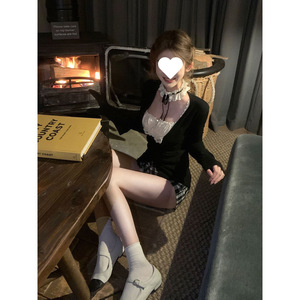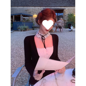 vtg千金 中古蕾丝花边背心黑色修身开衫波点高腰短裤气质三件套