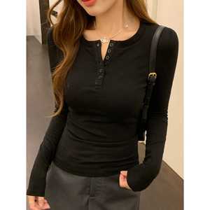 别致半开领纽扣正肩打底上衣女春秋季修身甜辣妹长袖T恤内搭小衫