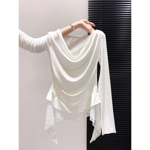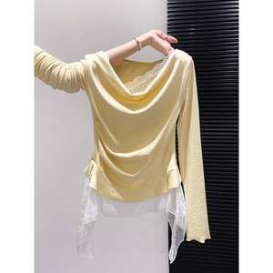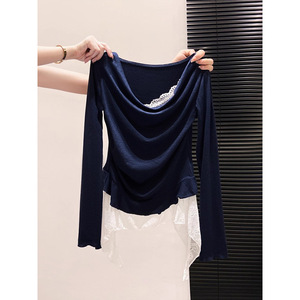 纯欲甜辣妹假两件荡领打底衫女蕾丝拼接上衣长袖t恤2025秋季新款