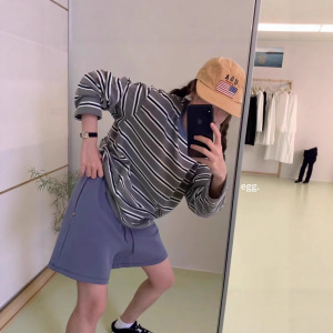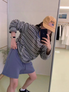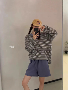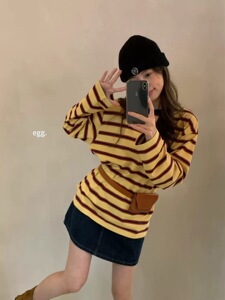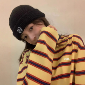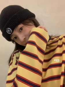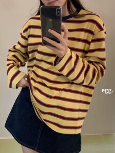 韩国egg东大门撞色条纹刺绣口袋圆领长袖T恤女 宽松叠搭打底上衣