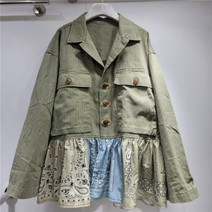 2025秋季新款军绿色拼接腰果花撞色复古牛仔外套 设计感小众上衣