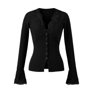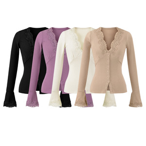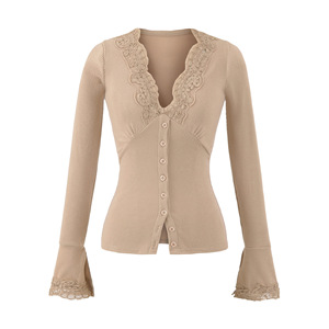 轻熟风气质V领拼接蕾丝长袖上衣女秋冬新款单排扣喇叭袖T恤开衫