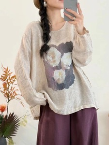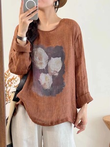 古咖服饰复古亚麻印花圆领上衣女式长袖宽松套头T恤文艺休闲上衣