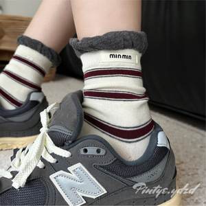 秋冬miu系撞色宽条纹泡泡口袜子女中筒学院风少女花边布标堆堆袜