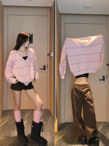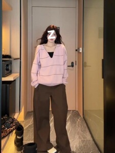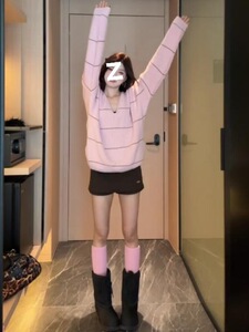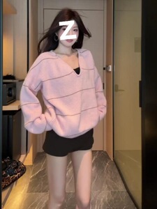 粉色V领毛衣条纹长袖针织衫女2025新款早秋季宽松慵懒风外穿上衣
