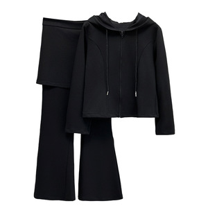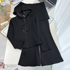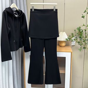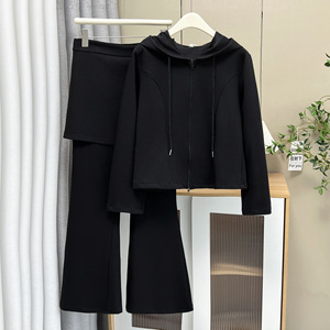 大码女装休闲套装200斤胖妹妹显瘦连帽上衣喇叭裙裤两件套8423