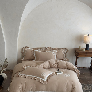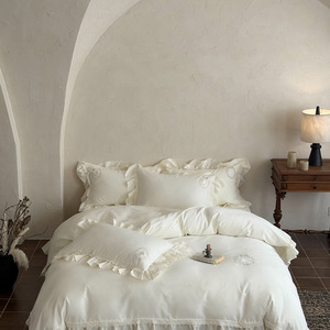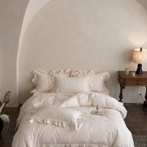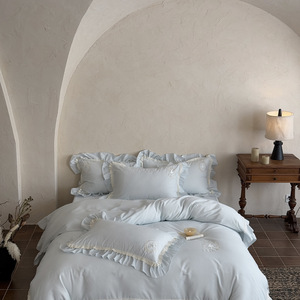 韩式小清新少女风全棉磨毛四件套秋冬加厚木耳花边被套床品蓝色
