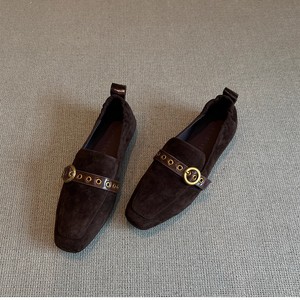 现货复古方头平底百搭单鞋女休闲一脚蹬懒人鞋金属皮带扣乐福鞋