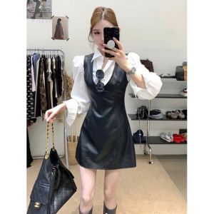 套装女2025秋新款法式气质设计感长袖衬衫收腰显瘦背心皮裙连衣裙