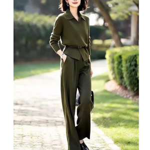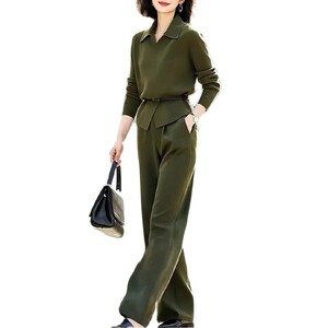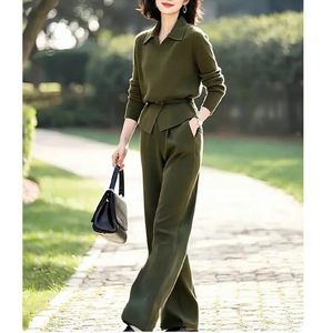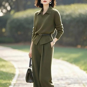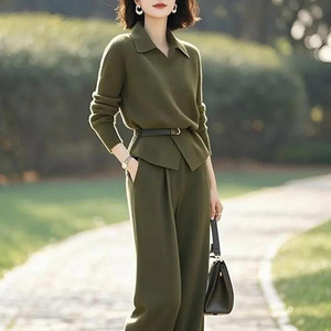 2025超火春秋一整套气质高级感独特漂亮绿色针织衫休闲裤子套装女