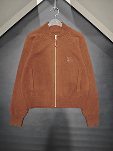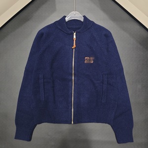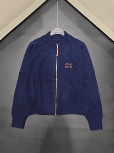 深圳南油高版本miu家皮革字母绣长款立领拉链羊毛针织开衫外套女