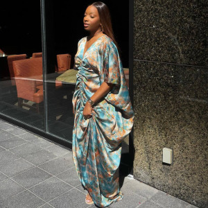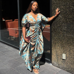 欧美大码深V领印花抽褶连衣裙女非洲洋气新款宽松休闲女装长裙子