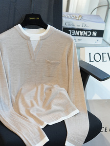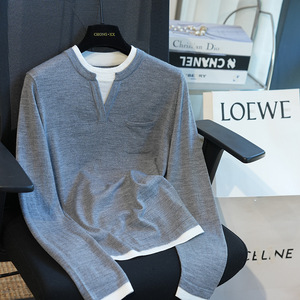 美丽诺羊毛假两件亨利领长袖针织衫女单口袋装饰毛衣秋季新款