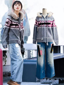 现货田曦薇同款提花毛衣外套女25秋冬新款气质拉链连帽针织开衫女