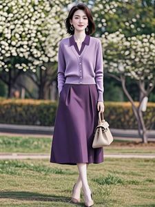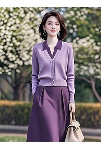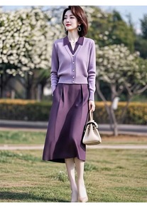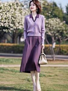 巨好看的早秋一整套轻奢高级感大气小香风紫色针织连衣裙两件套装
