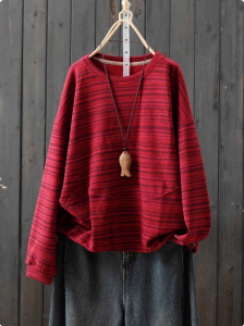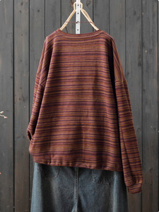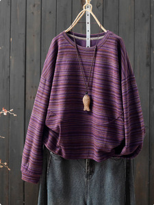 秋季2025年新款复古文艺条纹圆领长袖卫衣女直筒宽松T恤百搭上衣