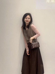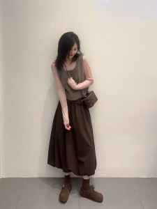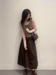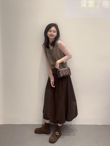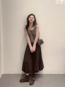 2025秋季新款韩系气质甜美粉色打底衫百搭马甲背心高腰花苞裙套装