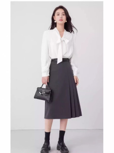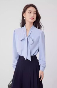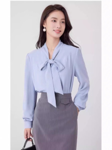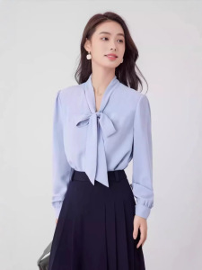 衬衫长袖飘带通勤蝴蝶结雪纺职业蓝色白色衬衣女春秋小众知性风