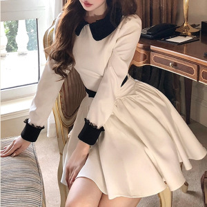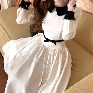 ao黛丽 经典分割线赫本连衣裙拼色娃娃领蝴蝶结显瘦a字裙2025秋季