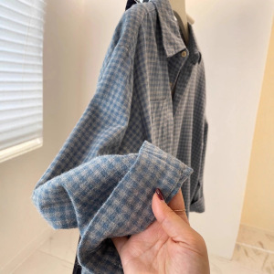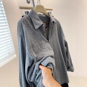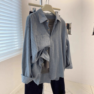 复古水洗磨毛蓝色格子衬衫外套女春秋加厚宽松休闲外搭叠穿上衣潮
