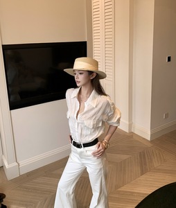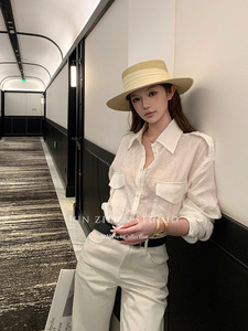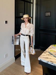时尚套装两件套洋气白色衬衫宽设计松微透长袖上衣休闲微辣长裤女