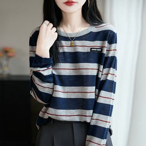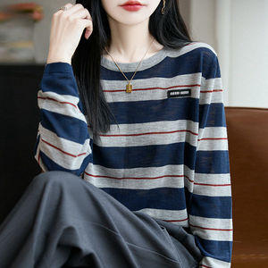 条纹长袖T恤衫女2025秋冬新款宽松撞色竹节麻打底衫毛衣外穿罩衫