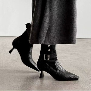 欧美风设计感尖头短筒靴女2025年秋季新款英伦风粗跟侧拉链时装靴