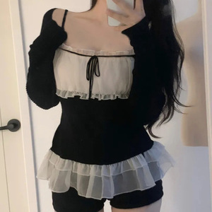 纯欲甜美风少女减龄网纱拼接系带蝴蝶结吊带+气质韩系ins长袖开衫