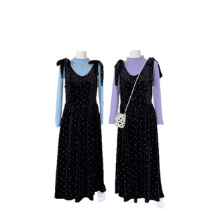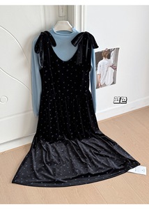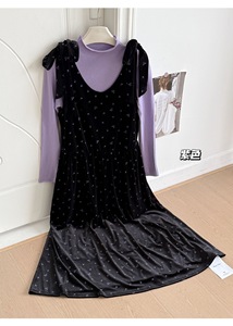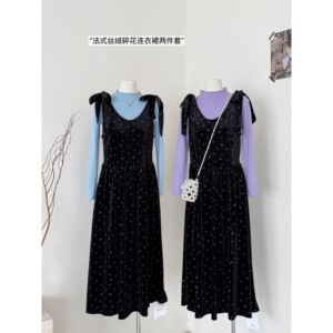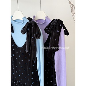 韩系早秋新温柔气质长袖打底针织衫+绑带蝴蝶结连衣裙两件套