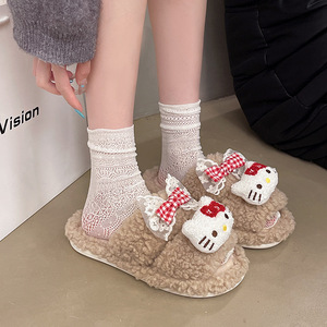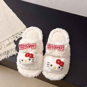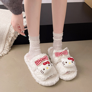 可爱卡通蝴蝶结猫猫毛毛拖鞋女2025秋冬季新款保暖毛绒一字棉拖鞋