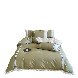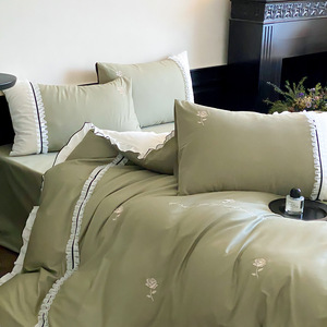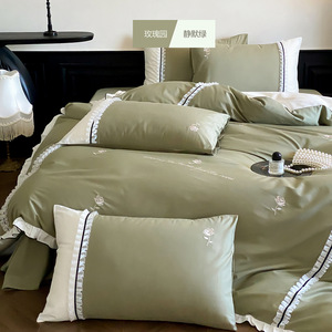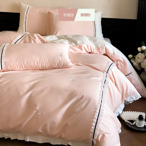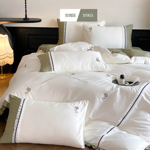 现代简约轻奢风全棉水洗棉四件套少女心玫瑰花刺绣木耳小花边被套