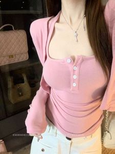 早秋穿搭一整套装粉色短款长袖开衫上衣女挂脖吊带背心辣妹两件套