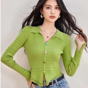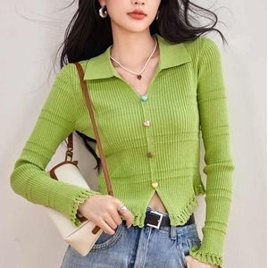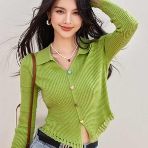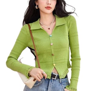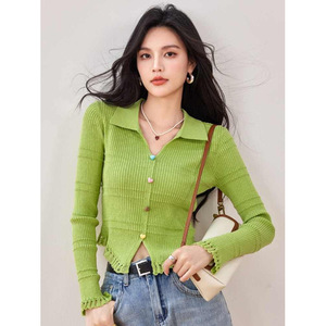 2025秋季绿色气质设计感薄款针织衫女洋气收腰显瘦短款上衣毛衣女