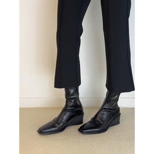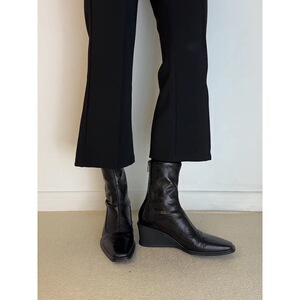 牛皮版~英伦风方头真皮弹力瘦瘦靴女坡跟增高软皮黑色后拉链短靴