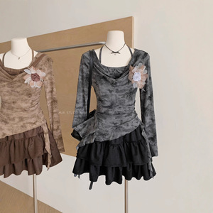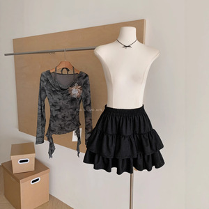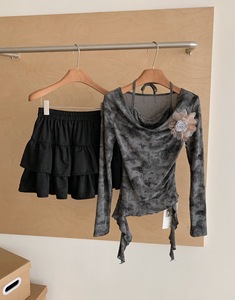 韩系气质感假两件荡领长袖T恤+高腰荷叶边蓬蓬半身裙两件套女