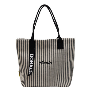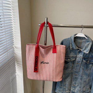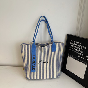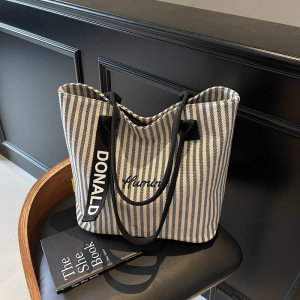 跨境工厂直销单肩条纹学生上课通勤手提托特包新款百搭帆布包包女