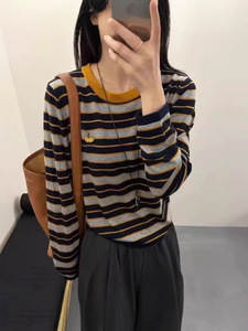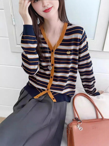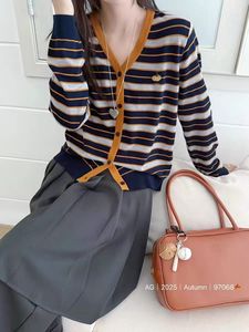 高级感桔色条纹V领长袖针织开衫2025秋新款女装气质毛衣外套上衣