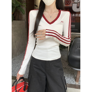 美式V领撞色条纹长袖T恤女2025秋季新款刺绣设计感修身显瘦打底衫