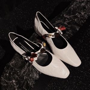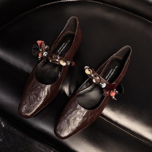 2025新款四季女鞋羊皮复古棕色花朵串珠一字扣带低跟平底浅口单鞋