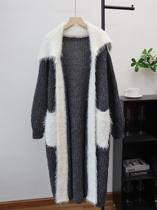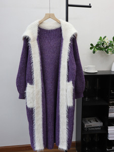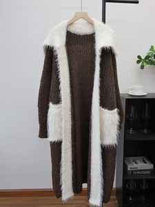 2025秋冬新款长款过膝拼接仿水貂绒针织开衫宽松慵懒风毛衣外套女