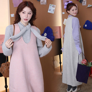 秋冬新款 韩系甜美温柔风宽松叠穿毛呢背心连衣裙两件套
