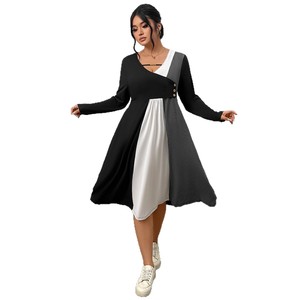 欧美秋季新款连衣裙V领纽扣拼接设计感连衣裙女收腰显瘦A字裙