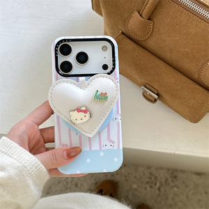 磁吸-粉白竖条纹满屏KT猫 壳+立体皮纹白色爱心KT猫支架