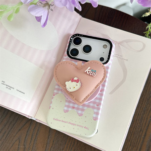 磁吸-粉白格纹爱心KT猫 壳+立体皮纹粉色爱心KT猫支架