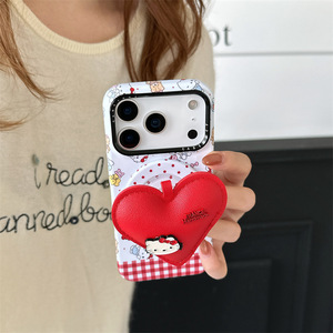 磁吸-红白格纹波点眨眼KT猫 壳+立体皮纹红色爱心KT猫支架